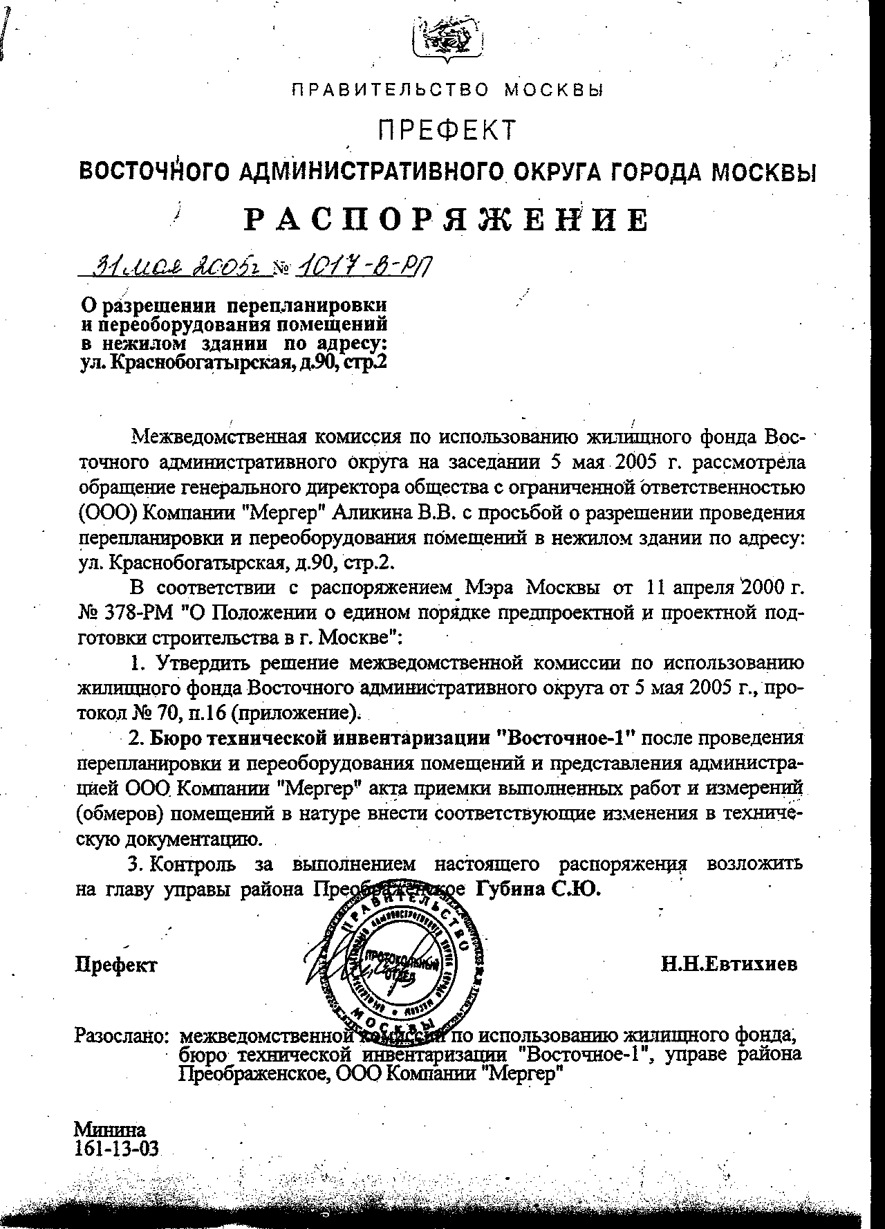 Распоряжение №1017 В-РП от 31.05.05 о разрешении перепланировки и переоборудования помещений в нежилом здании по адресу: ул. Краснобоготырская д. 90, стр. 2