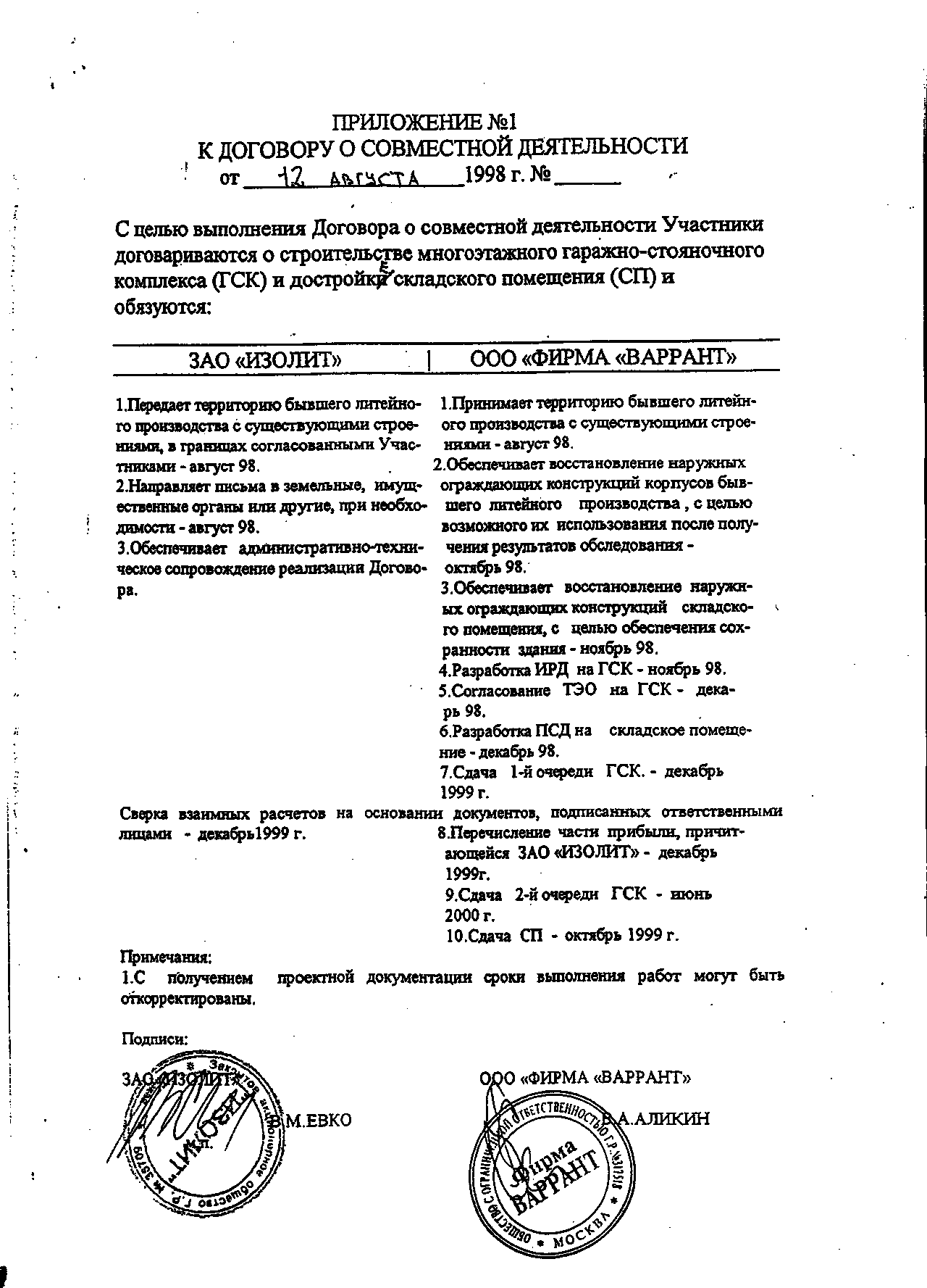 Приложение №1 к Договору о совместной деятельности