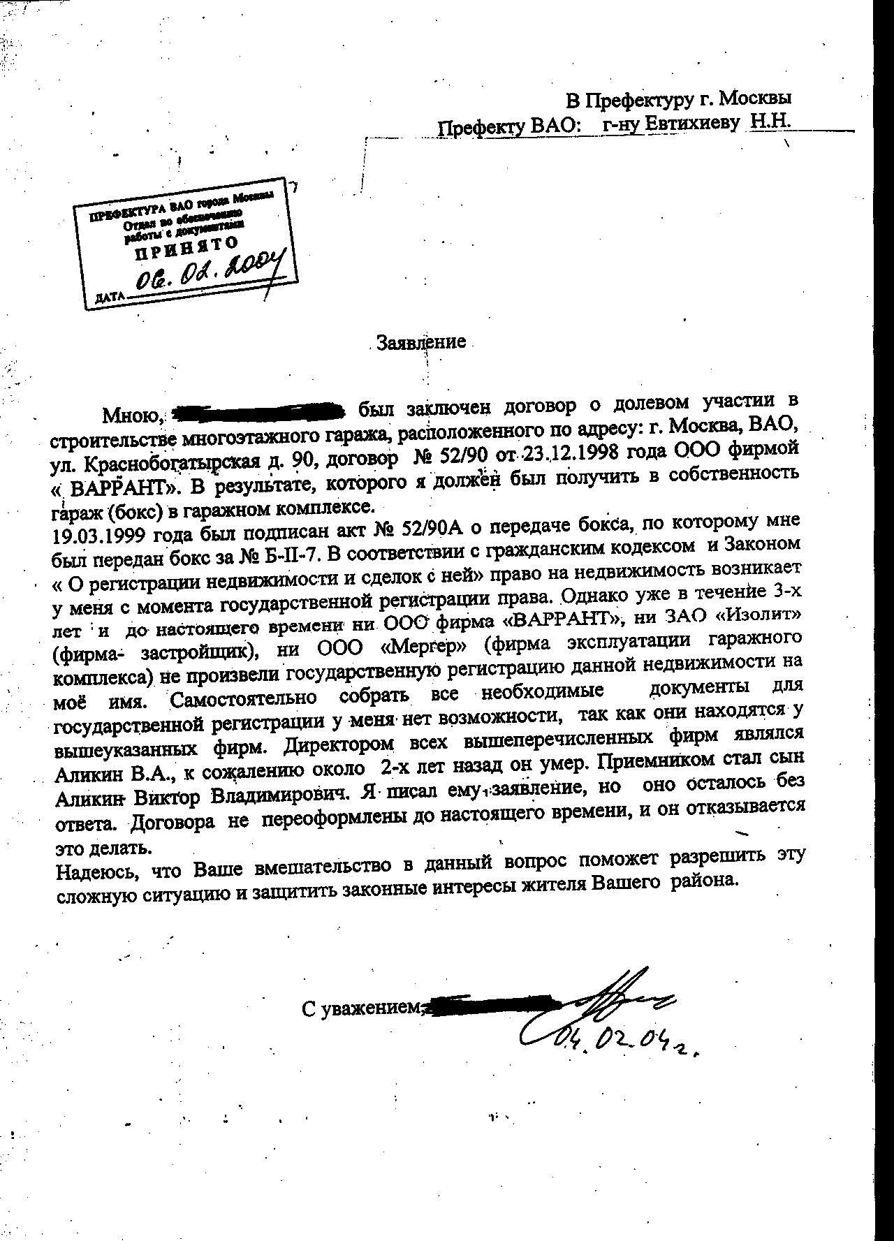 Префекту Восточного административного округа г. Москвы Евтихиеву Н.Н. от 02.02.04